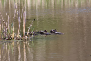 MATTS volunteers used floating basking traps, hands and dip nets to capture as many turtles as possible in late May, just before the pond was drained for construction. The turtles were placed in plastic bins and transported by volunteers to their new home. Volunteers took steps to disinfect equipment and footwear so as not to transport any disease-causing viruses or other organisms to the new pond.