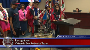 The Rockville robotics team Wizards.exe – and their robot G-Wiz – brought their magic to the Mayor and Council chambers at City Hall on Oct. 8 as the team was honored for representing the United States at the FIRST Global Challenge Championship in Mexico last summer. Competing with teams from 185 countries, the team of Rockville students won the gold medal for engineering design and the silver medal First Global Challenge Award. To watch the presentation and see Wizards.exe in action, visit youtube.com/cityofrockville and search “Wizards Recognition.”