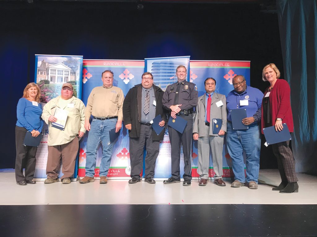The City of Rockville held its annual employee awards ceremony, Thursday, Dec. 6 at the F. Scott Fitzgerald Theatre. Ten Rockville employees were recognized with 30-year length-of-service awards. Pictured (L-to-R): Lisa Splaine, Recreation and Parks; Randy Maness, Steven Davis and Steve Sokol of Public Works; Maj. Bob Rappoport, Rockville City Police Department; Om Thukral, Information Technology; Kelvin Budd, City Manager’s Office; Jan Golden, Recreation and Parks. Not pictured are Tammy Koniski and Sherri-Lou Hendry, Rockville City Police Department.