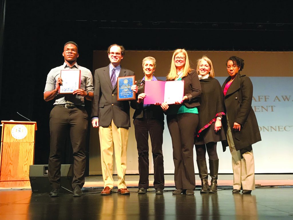 Rockville honored the legacy of Martin Luther King Jr. on Jan. 21 with community service and a celebration with a theme of “Enduring Hope, Enduring Progress.” Honored during the ceremony were Gideon Wikina (at left), who received the Dr. Martin Luther King Jr. Youth Award, and Adam Hoffman (second from left) and Julie Ryan-Silva, (third from right), accepting the F. Michael Taff Award on behalf of Main Street Connect Inc. Also pictured are (L to R): state Sen. Cheryl Kagan, Mayor Bridget Donnell Newton and Courtney Proctor, chair of the city’s Human Rights Commission. Find full coverage of the celebration at www.youtube.com/cityofrockville and all this month on Rockville 11 (channel 11 on county cable).