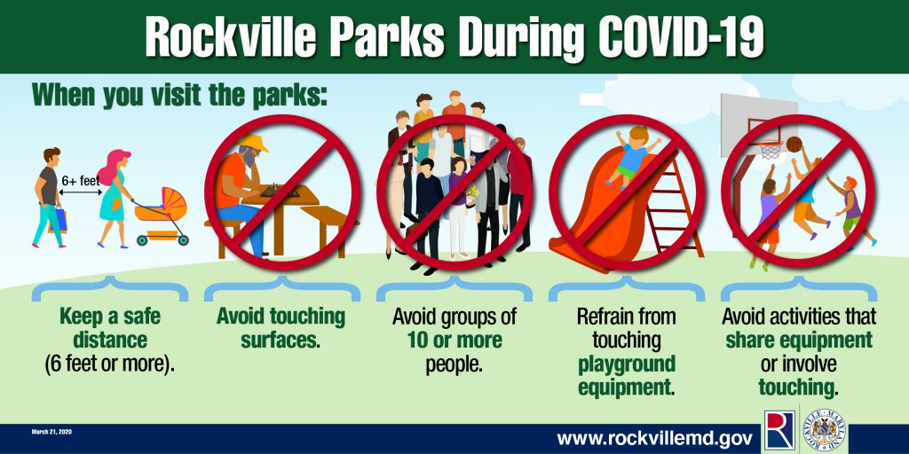 Bathrooms at Rockville’s parks are closed. While social distancing guidelines are in effect, the city does not recommend that children use play equipment, as COVID-19 can remain viable on surfaces for hours or longer.