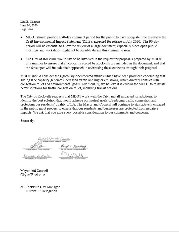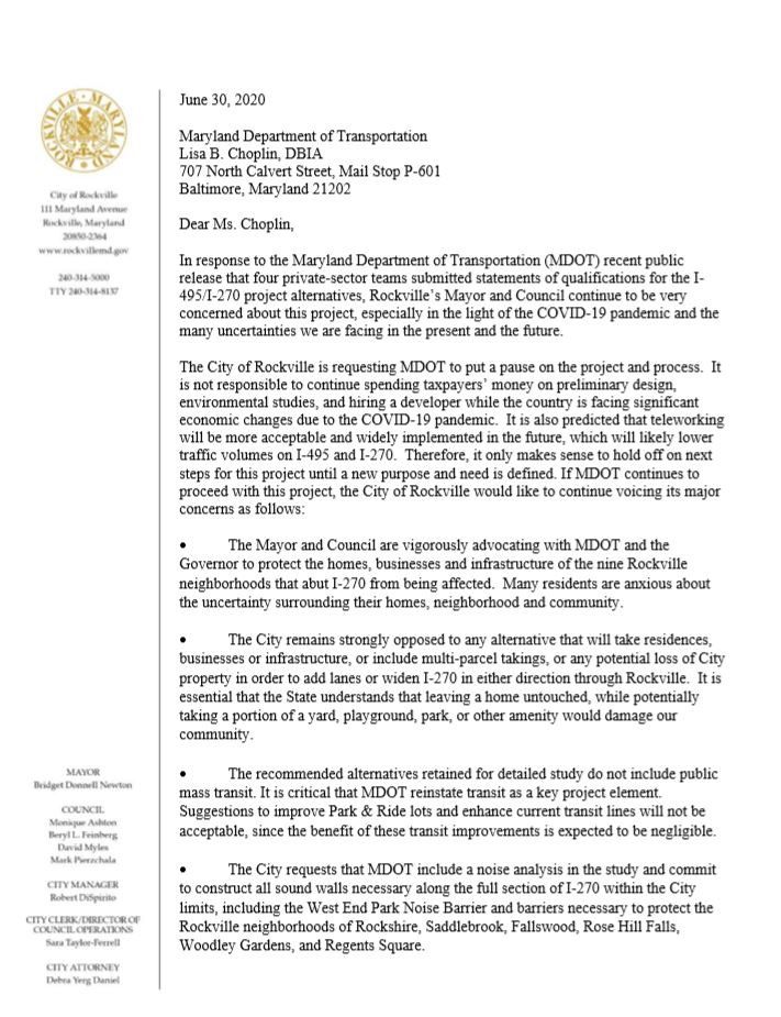 “The City of Rockville requests that MDOT put a pause on the project and process,” the letter states. “It is not responsible to continue spending taxpayers’ money on preliminary design, environmental studies, and hiring a developer while the country is facing significant economic changes due to the COVID-19 pandemic. It is also predicted that teleworking will be more acceptable and widely implemented in the future, which will likely lower traffic volumes on I-495 and I-270. Therefore, it only makes sense to hold off on next steps for this project until a new purpose and need is defined.”