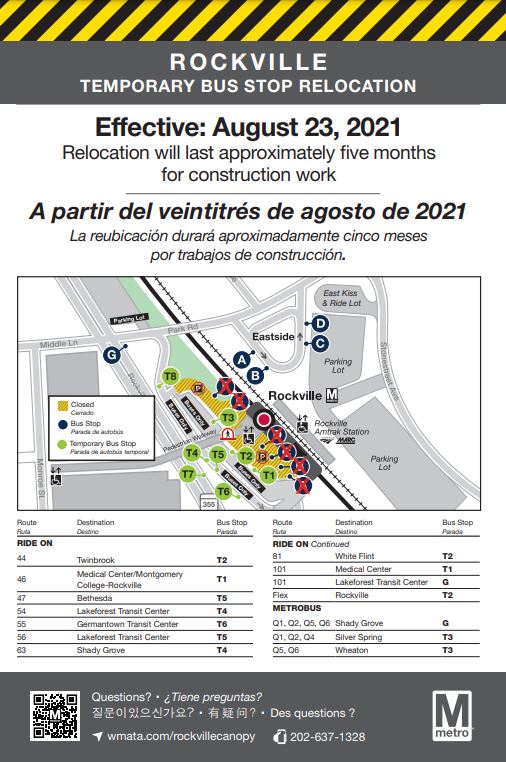 Meanwhile, bus stops are being relocated on the grounds of the Rockville station and staging activities are beginning ahead of repairs to canopies on the Rockville and Shady Grove Metro station platforms. The construction will close the Rockville and Shady Grove stations from Saturday, Sept. 11-Saturday, Dec. 4.