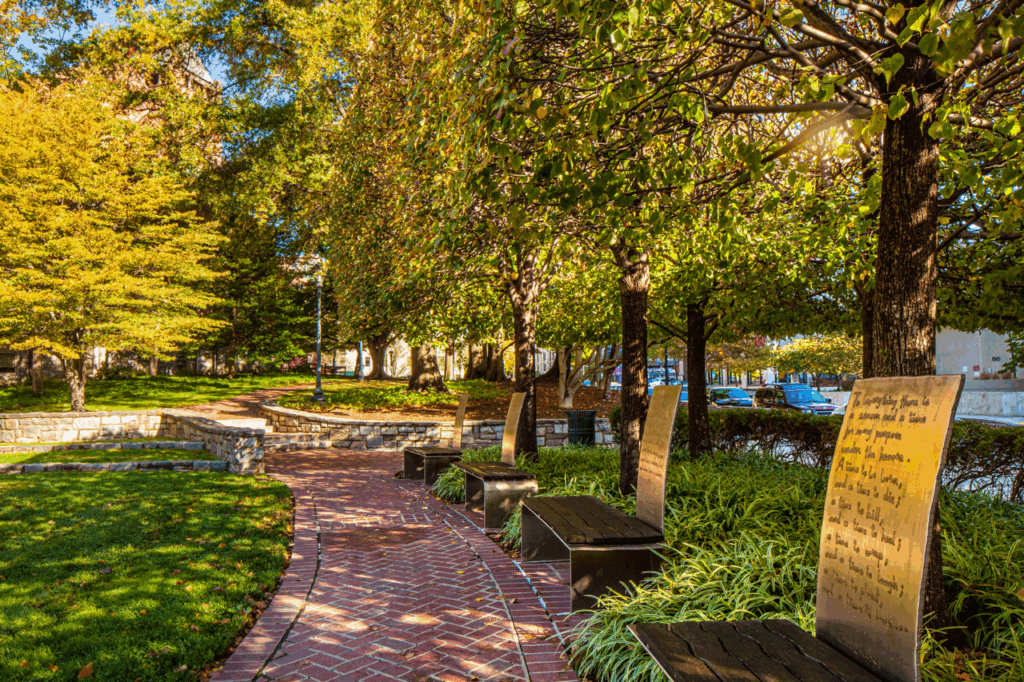 The memorial, commissioned by the Montgomery County Arts and Humanities Council and designed by artists Gene and Susan Flores, includes a grassy area circled by 11 benches – one dedicated to each victim, with an inscription related to that person’s character. It also includes a plaque, covered by two doors, bearing the victims’ names. The artists worked with astronomers to design the memorial so that on Sept. 11 the morning sun briefly illuminates each name.