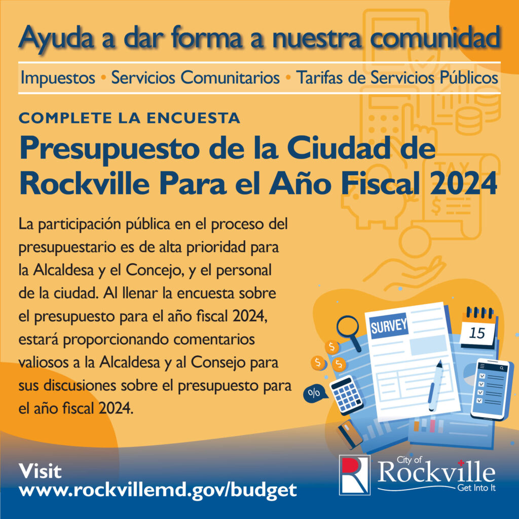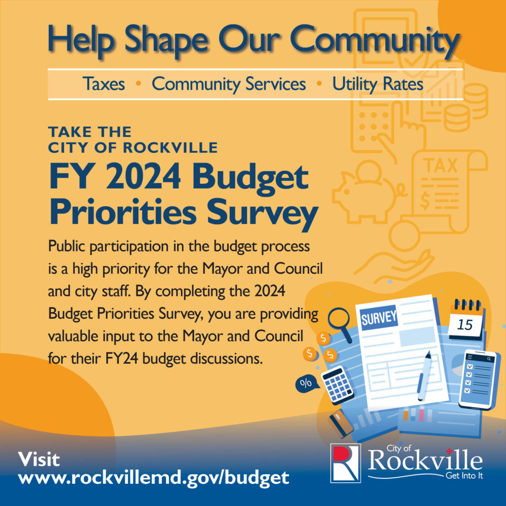 Public participation in the budget process is a high priority for the Mayor and Council and city staff. A community budget priorities survey is available in English, simplified Chinese, French, Korean and Spanish, at www.rockvillemd.gov/budget. The survey allows community members to identify their budget priorities and options for maintaining a balanced budget. Survey responses provide valuable input to the Mayor and Council for their budget discussions.