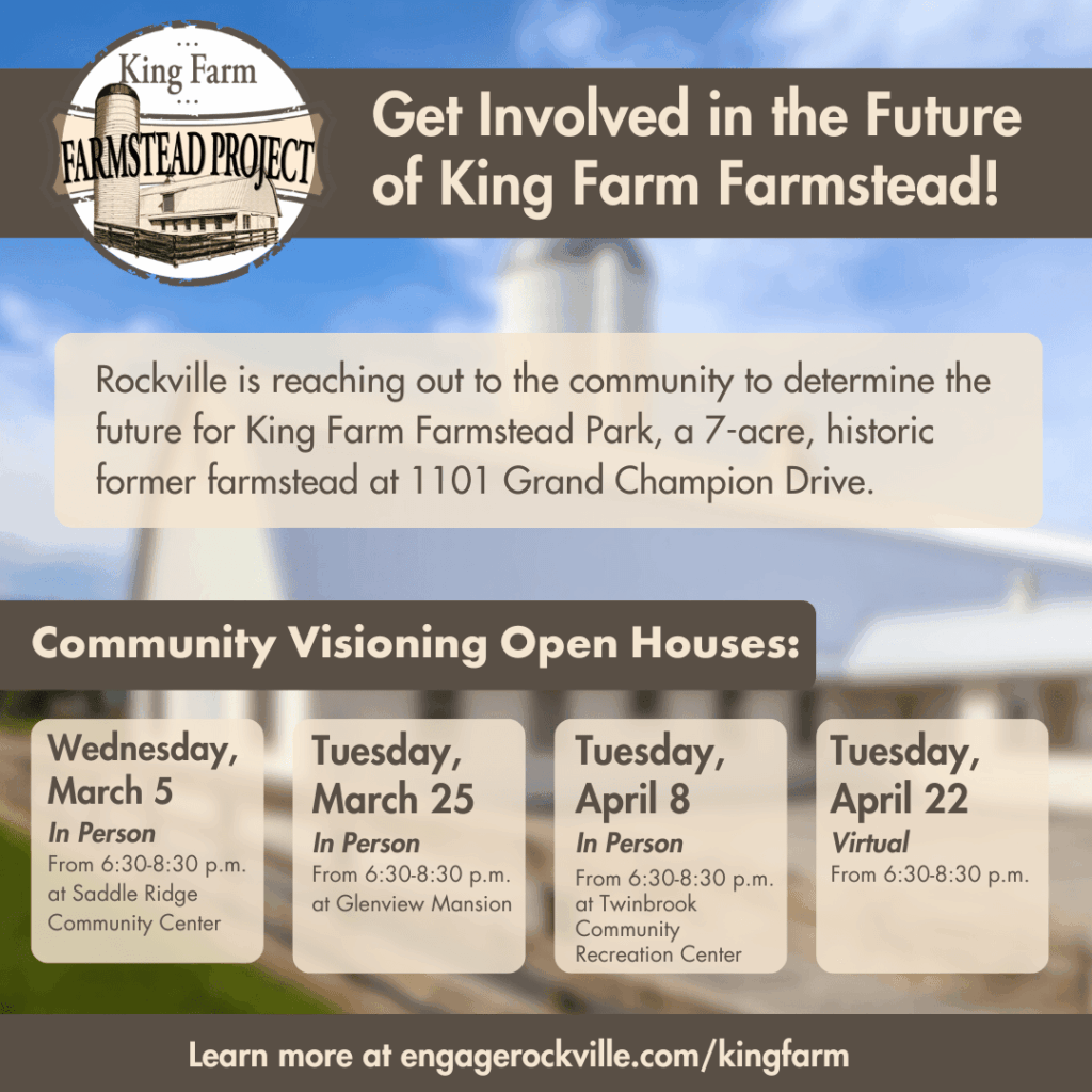 Rockville’s efforts to engage the community in shaping the future of King Farm Farmstead Park, a 7-acre historic site at 1101 Grand Champion Drive, continue with upcoming opportunities for public input, both in person and virtual.