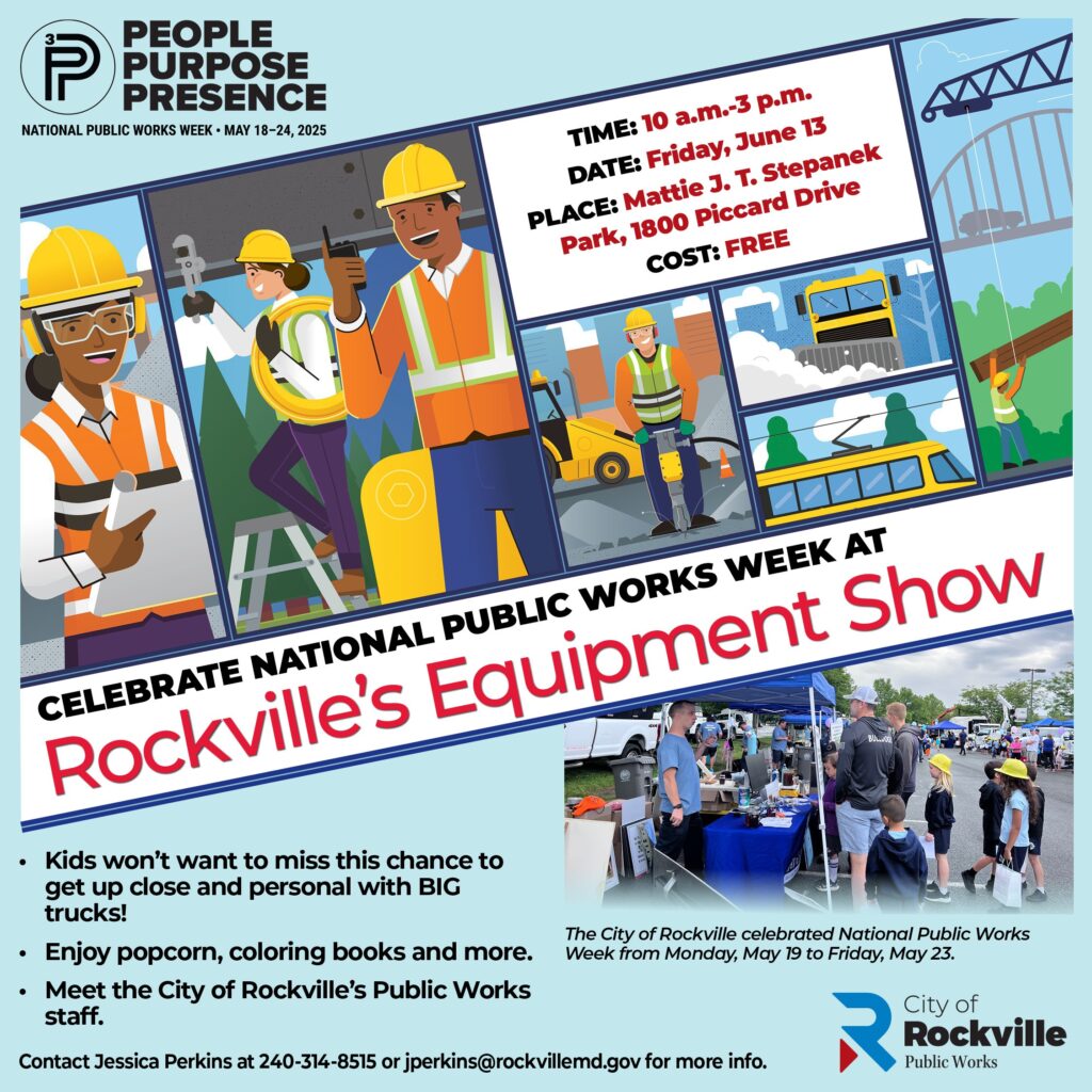 The free show includes displays, demonstrations, popcorn, coloring books and other giveaways, and the chance to meet some of the public works employees who provide important services that keep Rockville running. It features exhibits on recycling and trash, environmental management, the city’s water treatment plant, water and sewer operations, and stormwater management. School and daycare groups are welcome.