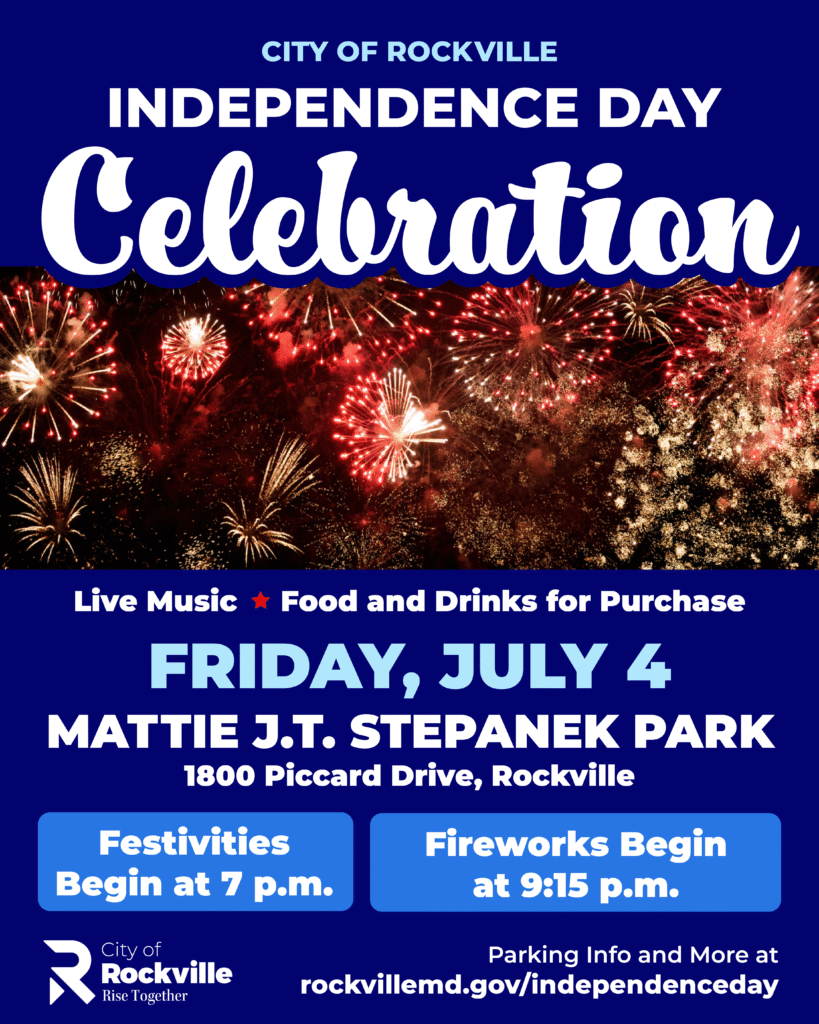 Hosted by the Mayor and Council, the celebration will once again be held from 7-10 p.m. at the 26-acre Mattie J.T. Stepanek Park, 1800 Piccard Drive, in King Farm, which offers easy access and ample free parking, with convenient exits within a short walk of the fireworks viewing areas.