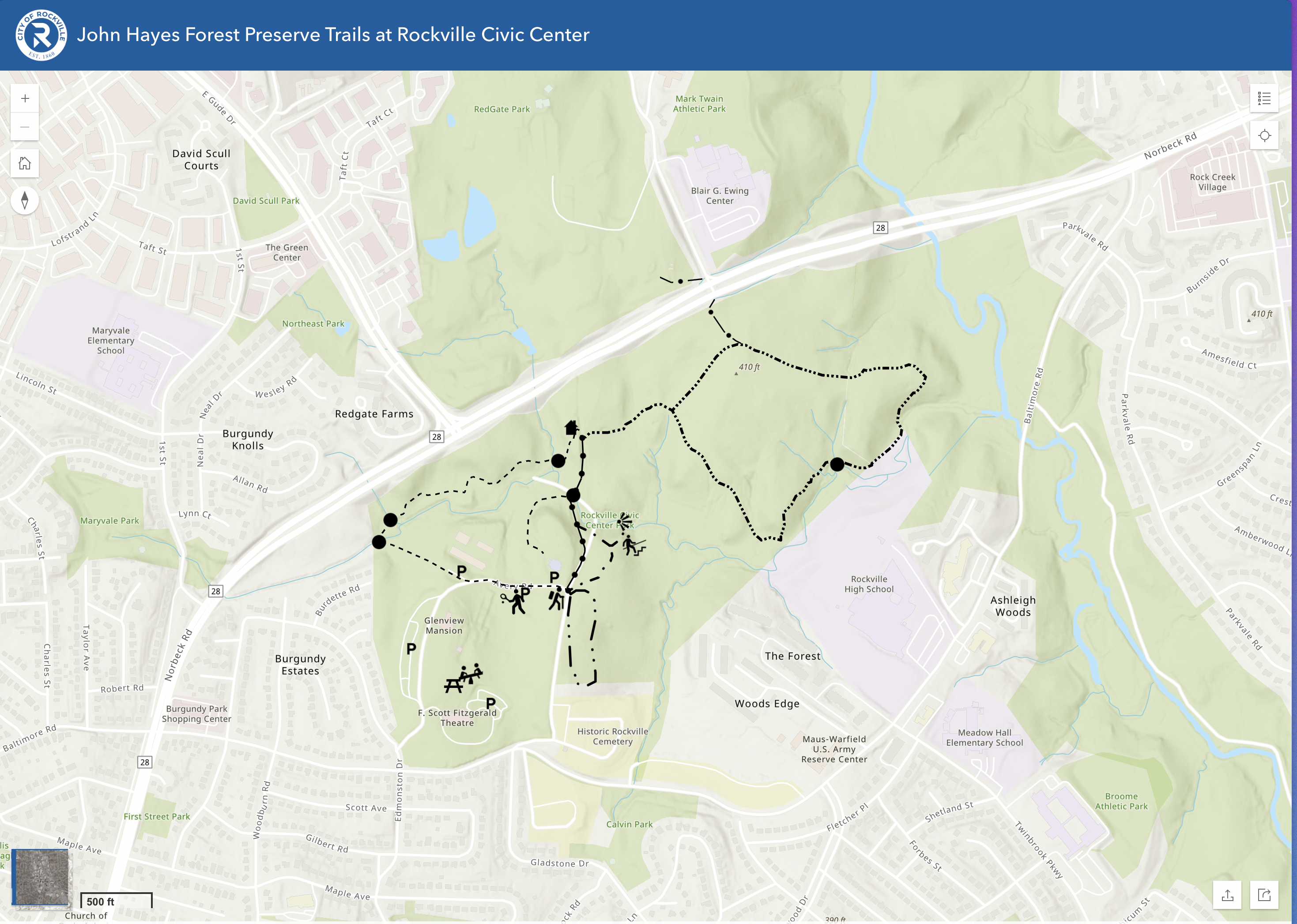 The map also lists points of interest and amenities within Rockville Civic Center Park, including parking locations, picnic areas and the trailhead.